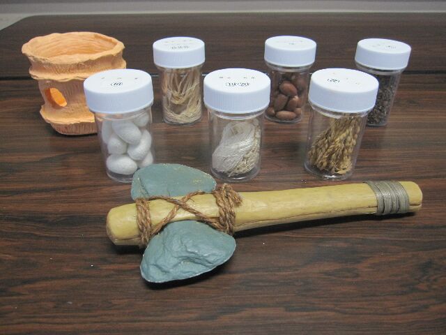 | 縄文人が食べていた木の実や、衣服に使っていた布などの実物です。道具のレプリカもあります。 | 弥生時代の学習で紹介されている金印のレプリカです。 | 古墳の副葬品である埴輪のレプリカです。 |
