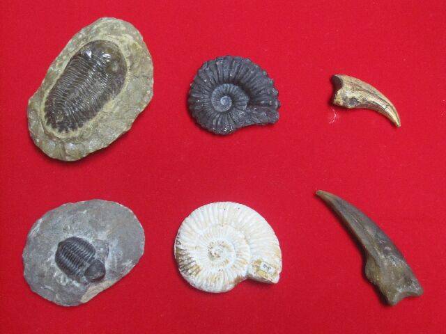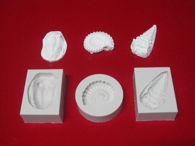 | 「古生代」「中生代」「新生代」の本物の化石標本です。 | 三葉虫やアンモナイトの本物の化石と恐竜の歯や爪の化石レプリカです。触って観察できます。 | 型に石こうを流し込むことで、示準化石(三葉虫・アンモナイト・ビカリア)のレプリカを作ることができます。 |
