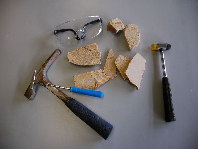 | 化石の発掘に必要なハンマー、たがね、ゴーグルなどの道具一式です。 | 中学校の教科書などで紹介されている堆積岩や火成岩の標本です。県内で採取しました。 | 県内で採取した泥岩・砂岩・礫岩の標本です。大型なので、手触りで違いを比べることができます。 |